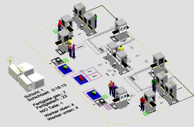 Fragestellungen waren die Ausbringungen bei unterschiedlichem Mitarbeitereinsatz, die optimale Positionierung der Maschinen, die benötigte Menge von Werkzeugträgern und sinnvolle Puffergrößen.